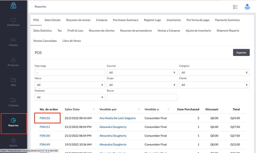 Para esto nos tendremos que ir a la sección reportes y buscar el número de orden que deseamos anular.