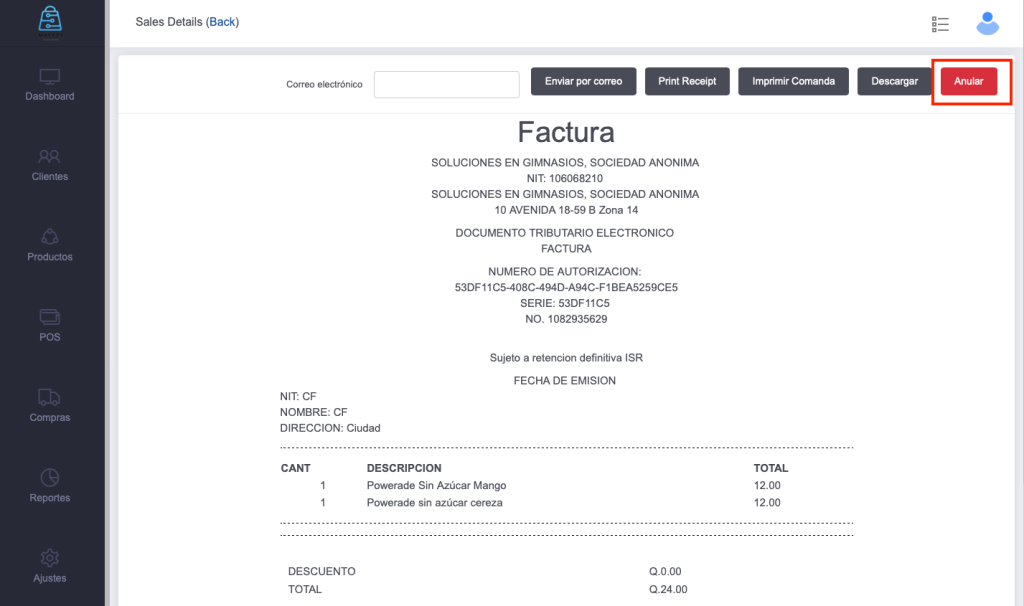 Daremos clic en el número de orden, se nos abrirá la factura y deberemos presionar el botón «Anular»
