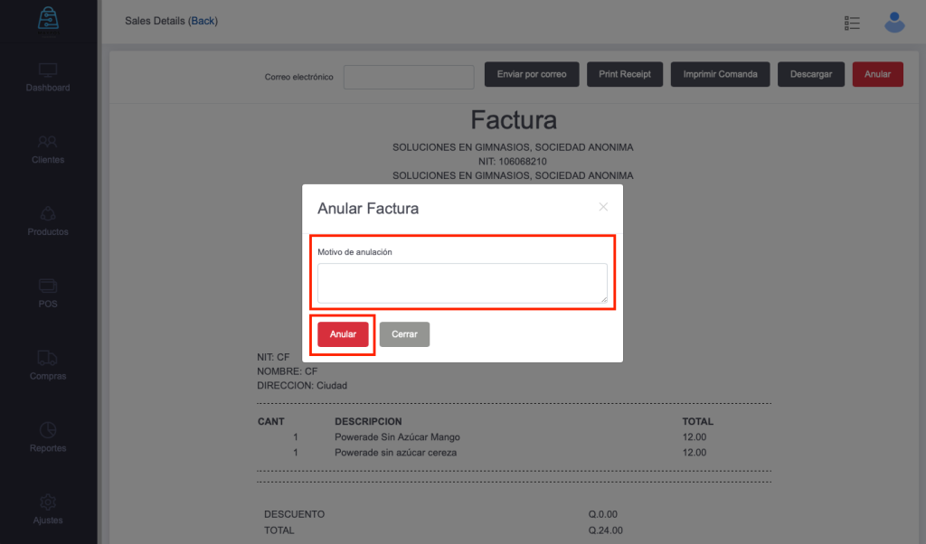 Al presionar el botón se nos abrirá un pequeño formulario donde tendremos que escribir el motivo de la anulación y darle clic a «Anular»