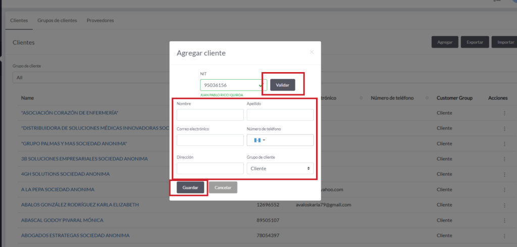 2) Nos saldrá un formulario donde deberemos validar el NIT e ingresar la información del cliente, seguido daremos clic en el botón Guardar.