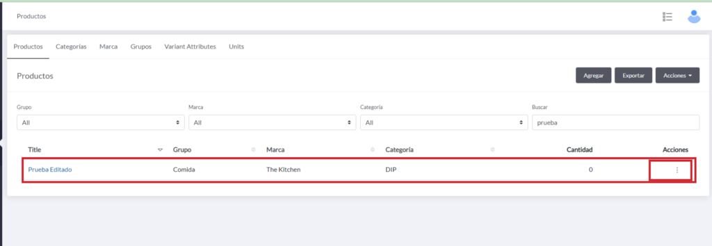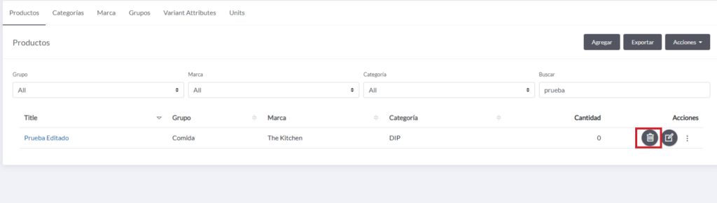 1) Nos iremos a la sección productos y daremos clic sobre el botón con tres puntos del producto que deseamos eliminar.