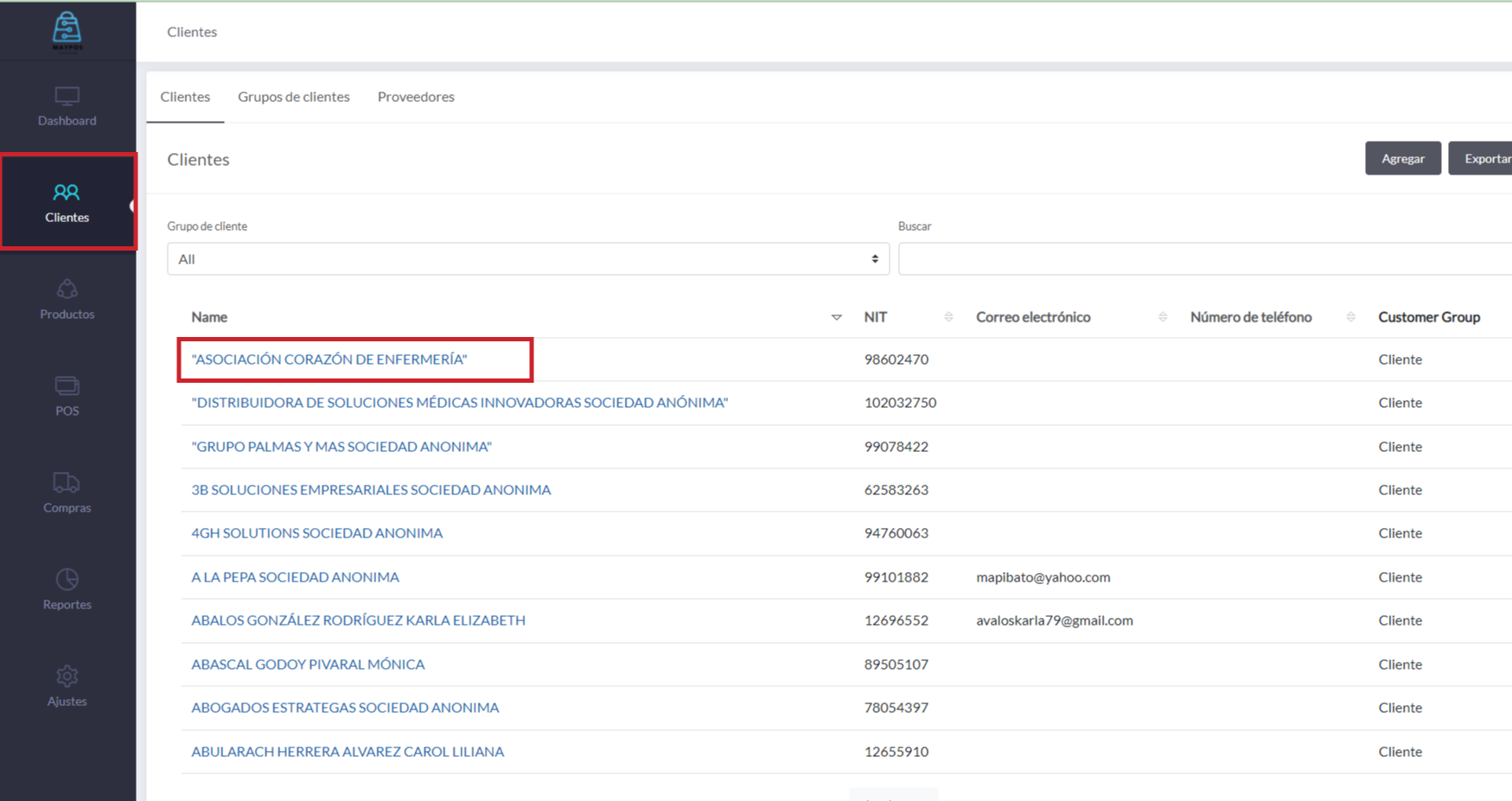 1) Iremos a la sección cliente y presionaremos el nombre del cliente del que queremos ver su récord.