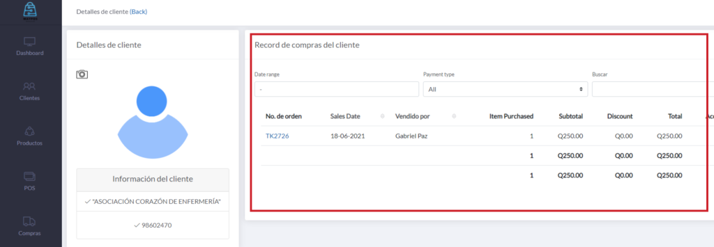 2) Se nos desplegará la información del cliente junto con su récord de comprar.