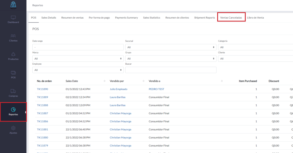 1) Nos iremos a la sección de reportes y haremos clic sobre el apartado «Ventas canceladas».