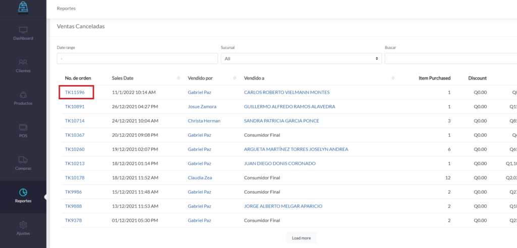 2) Se nos desplegarán todas las ventas que han sido canceladas, podemos clic sobre él No. De orden para ver más detalles.